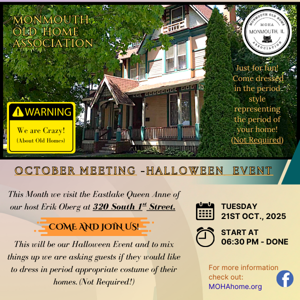Our Monmouth Old Home Association’s October meeting will be a special Halloween Event. Add to the fun by coming dressed in the period of your home!